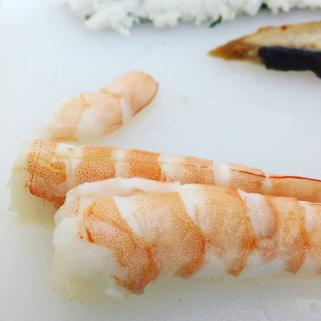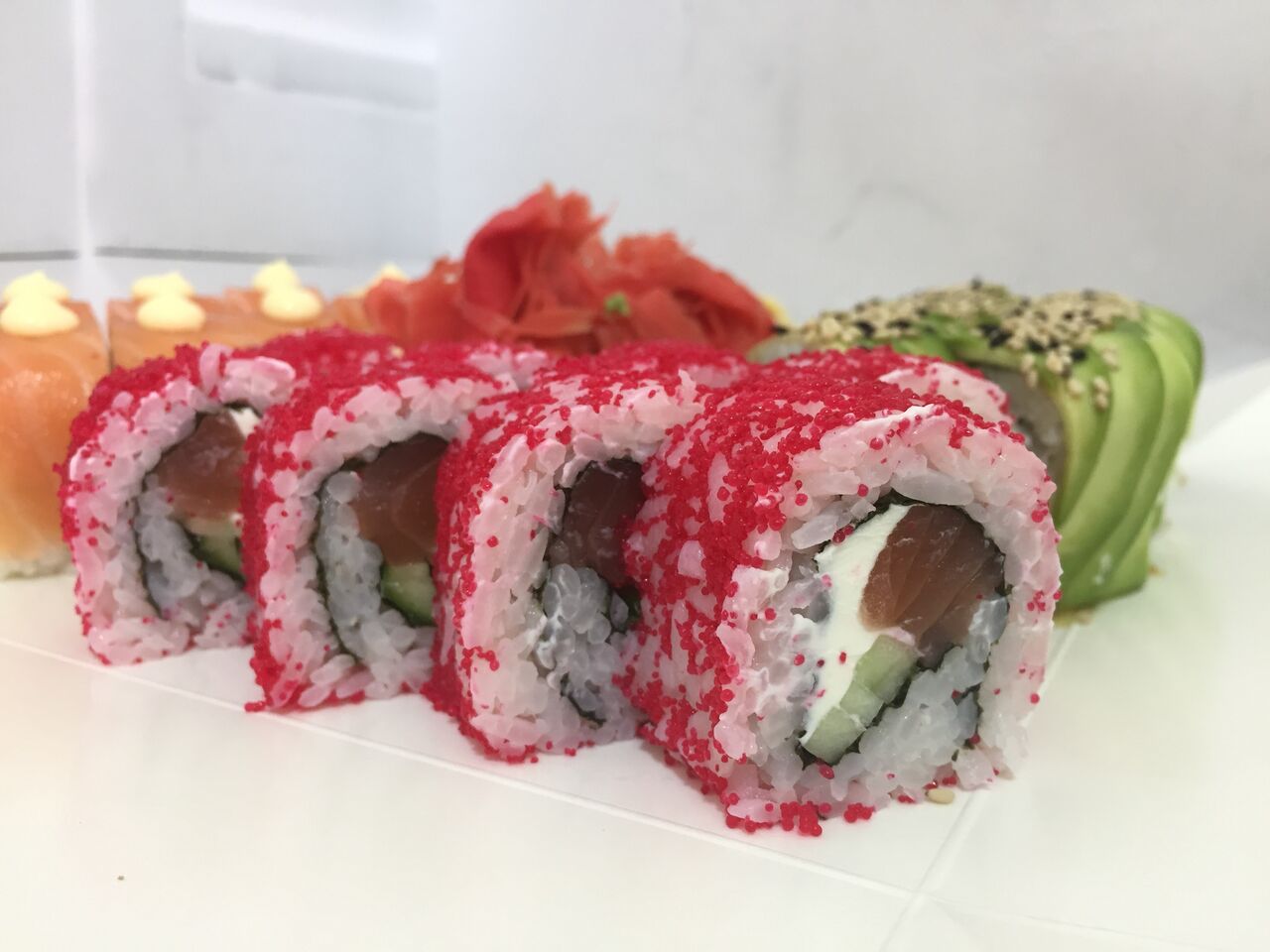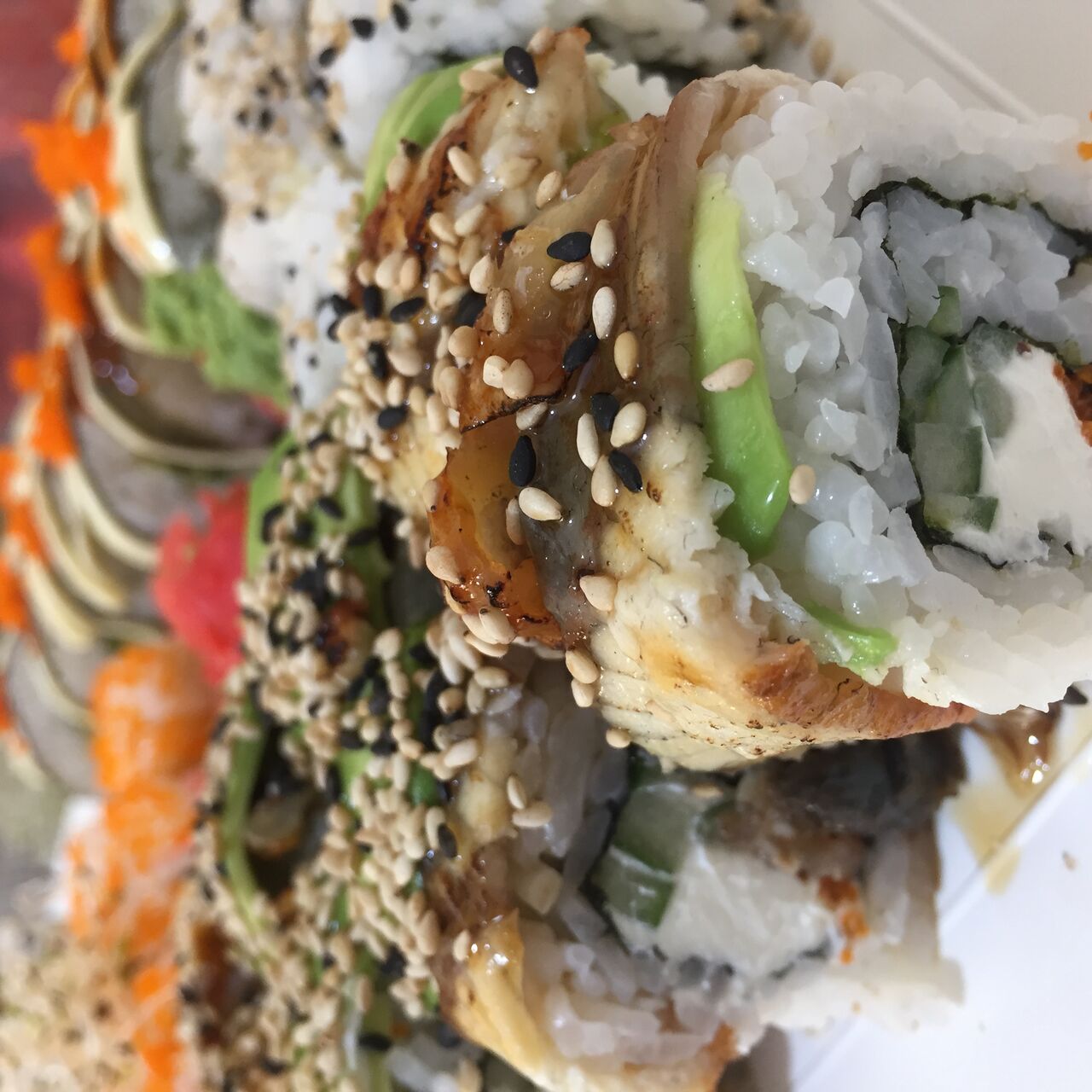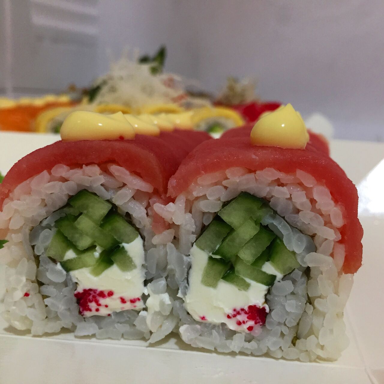 Також є варіант тепура рол з вугрем та креветками тигровими