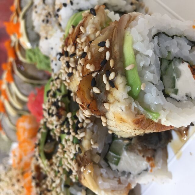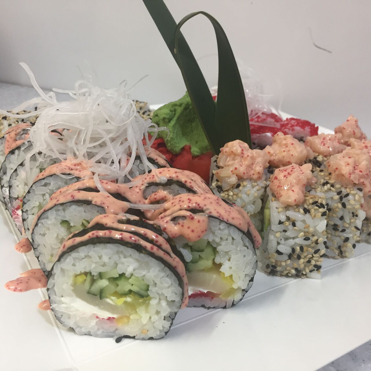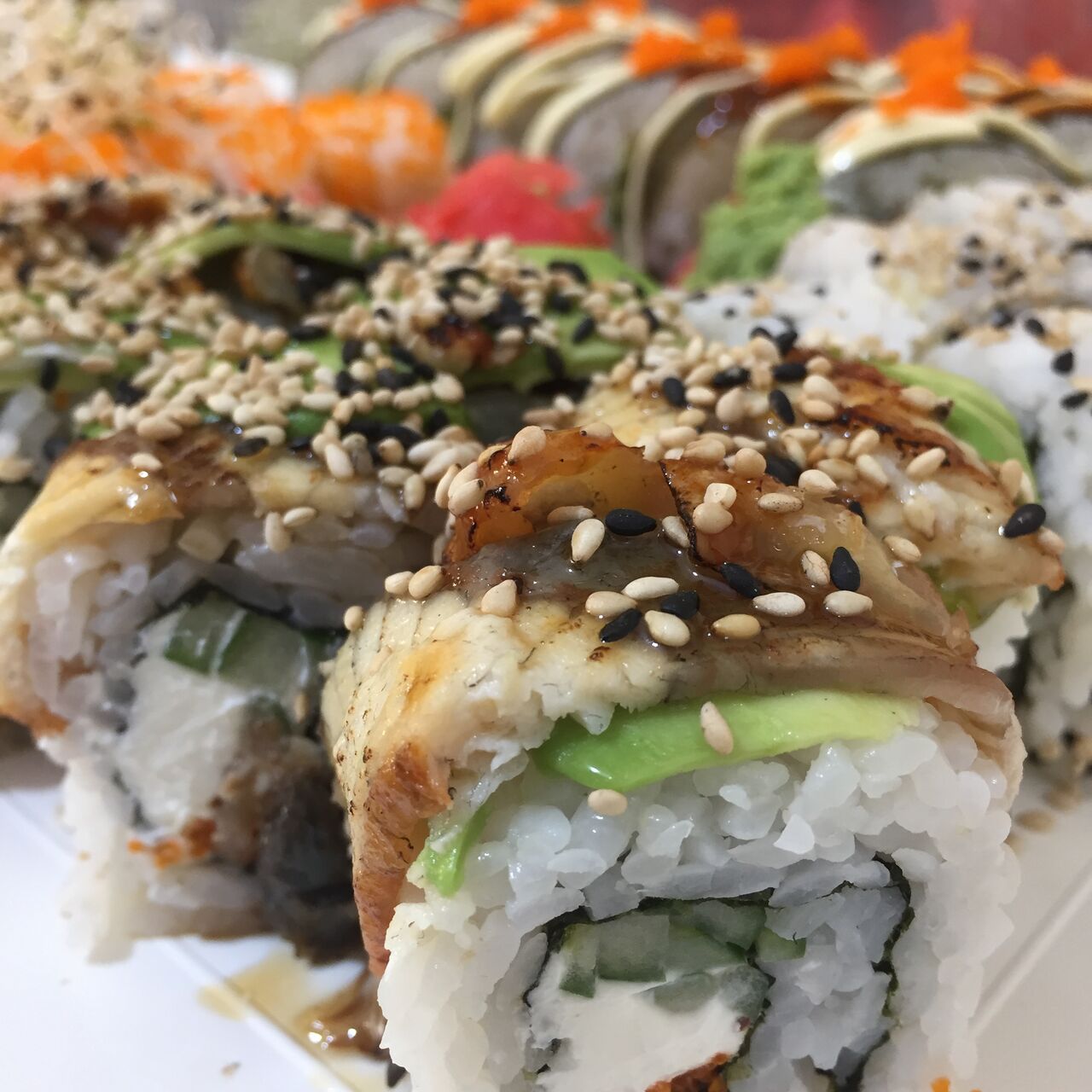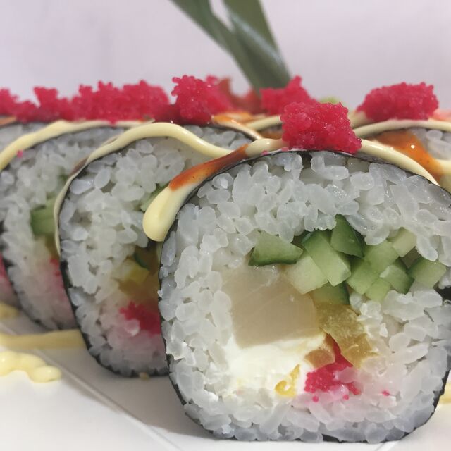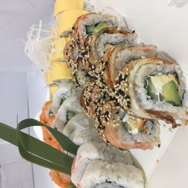Також є варіант тепура рол з вугрем та креветками тигровими